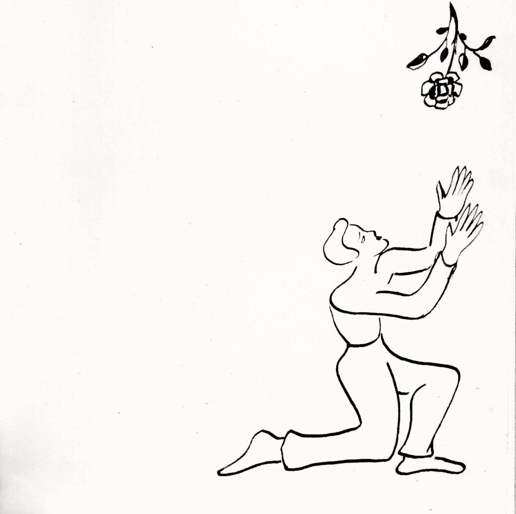 Zuerst träumt er sehr verworrenes Zeug. Aber dann erscheint eine Fee, und die Wirrnisse beginnen sich zu lichten. Sie tritt zu ihm, der er im Traum wiederum auf einer Wiese schläft, löst seine krampfhaft um einen lauteren Kristall gespannten Finger und streichelt sein Herz, bis eine gelbe Rose auf seinem himmelblauen Gewand erwächst.
