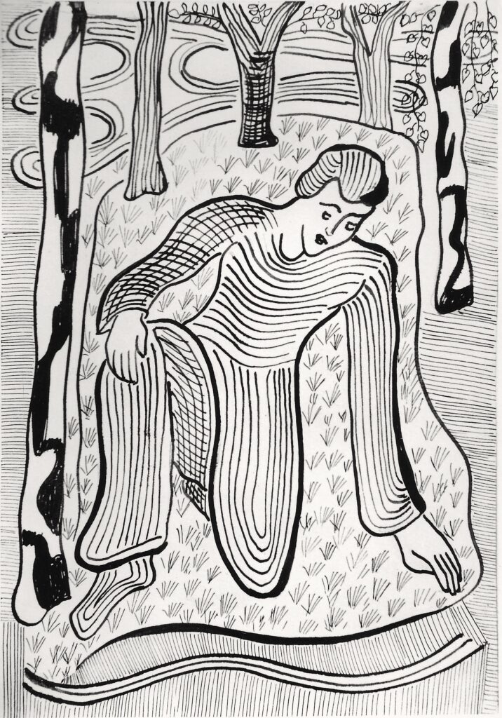 In einer Baumkrone, unweit der Stelle, wo der Prinz eingeschlafen ist, webt eine Fee – weich, zerfließend, gestaltlos – an unsichtbaren, geheimnisvollen Schleiern, vom Duft der gelben Rose umgeben, die sie in sich trägt. Beim Knüpfen einer Masche am äußersten Rande des Schleiers erkennt sie den schlafenden Prinzen: das himmelblaue Gewand im Wiesengrün, die rosa mit Braun verzierten Schuhe, vom Blumenbunt fast verdeckt. Und sie gelangt zu ihm auf Fernreise: weich, zerfließend, gestaltlos, den Schleier hinter sich, die Rose in sich.