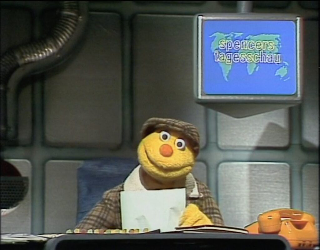 Eigentlich sind doch ein moderierender Spencer und ein Fernsehstudio ideale Ausgangspunkte für eine Sendung über Nachrichtenwesen. Auf einem Zettel steht: „Spencer wird seine Information nicht los.“ Das halte ich mal wieder nicht für abendfüllend.